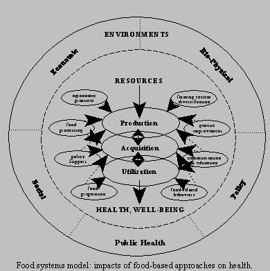 based strategies for preventing malnutrition. The concept encompasses all activities relating to the production, acquisition and utilization of food; it holds food systems as varied, complex, multicomponent systems with multiple inputs (labor, capital, knowledge, seed stock, etc.) and multiple outcomes, including the health and well-being of people within such systems. It considers these activities within several subsystems: production (including land use and tenure; soil management; crop breeding, selection and management; livestock breeding and management; and harvesting), acquisition (including food processing, transportation, storage, packaging and marketing; household purchasing; and food use traditions, practices and distribution) and utilization (including food preparation, processing and cooking; household food decision-making; food preferences; and access to health care, sanitation, energy and knowledge). The model holds the health and well-being of individuals as outcomes of these complex, nested subsystems interacting to varying degrees within biophysical, social, economic, public health and policy environments. From this perspective malnutrition is seen as a food systems failure.