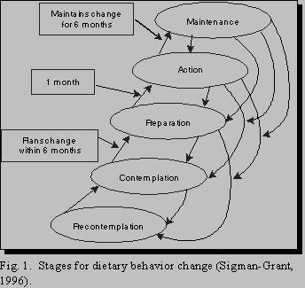Sigman-Grant (1996) examined the change in fat intake with this model. She found that people in the pre-contemplation stage were consuming about 37-38% of their calories from fat. Although they think about it, they don't do much about it. Their fat intakes don't change appreciably until they get a little more serious and prepare to change; then there is a slight decrease. Finally, they get into an action stage and show a significant reduction to about 35% of calories. If they persist in the behavior, their fats intakes will drop to slightly more than 30% of calories. Observations show that the nature of the change will greatly influence how quickly one moves through this model. In the case of eating more fiber, which might include merely changing the brand of breakfast cereal that one consumes, one can be expected to move more quickly than in the case of making a significant reduction in total fat which will call for changes in both the number and types of foods one consumes. Significant behavioral changes, such as the latter case, will occur much more slowly and will be less likely to be sustained. It becomes incumbent upon manufactures to recognize this process and to determine where in the sequence they can intervene in ways that make the change most acceptable.