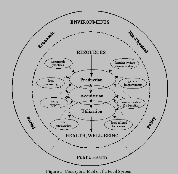 In addition, food systems were seen as existing within several environ-ments: a bio-physical environment, including such factors as geographic location, climatic conditions, soil types, indigenous plants and animals, etc.; a social environment, including such factors as traditions with respect to women's roles, etc.; an economic environment, including such factors as costs of food and shelter, value of labor, etc.; a public health environment, including such factors as access to health care, disease exposure burden, water quality, etc.; and a policy environment, including such factors as government subsidies, incentives and disincentives.