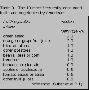 That the list of most frequently consumed fruits and vegetables (Table 3) is short shows that few Americans tend to consume servings of these foods more than once per week. In general, one-fourth of Americans surveyed regularly eat vegetables cooked in some type of fat. This rate is clearly higher among individuals of lower socio-economic status (33%) and among blacks (37% vs. 26% for Hispanics and 22% for whites). In addition, more than one-fifth reported adding cheese or cream sauces, butter, margarine or oil to cooked vegetables; and most (85%) added to green salads (the most frequently consumed vegetable dish) some sort of salad dressing only 61% of which is of a reduced-fat type. These data show significant increases (an estimated 28.5% for vegetables and 38% for non-citrus fruits) over the levels reported in the 1970's, which may reflect such trends as the emergence of salad bars in restaurants, the development of new varieties, increases in imports and improvements in consumer selection year-round. Despite these positive trends, Americans tend to eat relatively few servings of fruits and vegetables, particularly those of low-fat content.
