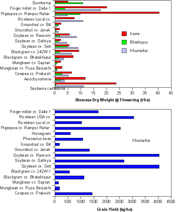 Data from the summer legume trials were variable between sites. With the exception of the Seti soybean cultivar, sunnhemp and pigeonpea, dry matter accumulations at Bhaktapur were below 4.5 t/ha, presumably due to cooler temperatures at this higher elevation. In contrast a majority of the forage type species were above 5 t/ha dry matter at Khumaltar and Kavre. Particularly noteworthy were dry matter production of finger millet, Sesbania cannabina, and Aeschynomene at Kavre, as well as finger millet and Sesbania cannabina at Khumultar. Grain yields were only available for Khumaltar, and seem a bit on the high side, suggesting that the weights may not have been adjusted for moisture content. Noticeable variation was observed within ricebean, soybean, black gram and groundnut cultivars. Ricebean cv. USA, all the soybean cultivars and the Rampur Rahar pigeonpea cultivar appear to offer several particularly promising grain legume options to farmers in this area. Nutrient acquisition between species and sites will be compared after nutrient analysis of the plant materials is complete.