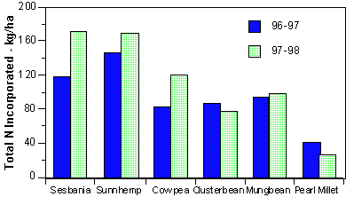 Nitrogen accumulation in above ground biomass was highest with crotalaria and sesbania, then cowpea, mungbean and cluster bean. Considerable N fixation took place if it is assumed that the 20-40 kg N/ha taken up by millet represents available soil N.
