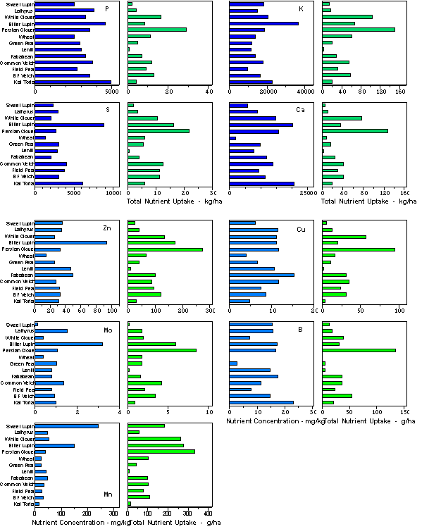 Nutrient concentration and total nutrient uptake by winter legume biomass collected at flowering in Khumaltar varied considerably by legume species (data on the following page). The concentration of most elements was higher in bitter lupin than the other species (especially for K, S, Zn, Mn [note also sweet lupin] and Mo) but a poor stand restricted total nutrient acquisition. However, this species appears to have the potential to extract large amounts of a range of nutrients if agronomic problems to its production can be overcome. With high biomass production, clover species, especially persian clover, had higher total nutrient uptake (kg/ha) for most nutrients than did other species in the trial.
