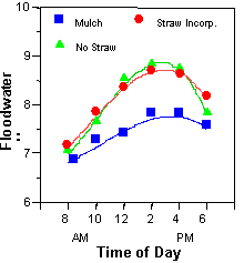 The reason(s) for the mulch effect is(are) are not completely resolved; possibilities include lowering of floodwater pH and reduced ammonia volatilization in the early stages of rice growth, suppression of weeds, and maintaining soil wetter in the latter part of the season when drought stress may occur. Nitrogen analysis of the first year rice grain and straw are currently underway to determine whether there were any treatment differences in plant N uptake.