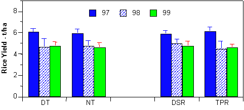 The experiment was begun with the 1997-98 wheat season with deep tillage prior to seeding, then again prior to rice. There were no significant effects of tillage or establishment method on yield (mean 2.9 t/ha) with the first wheat crop. However, surface seeding suppressed both grassy and broadleaf weeds and gave more tillers per plant. Also, deep tillage gave greater plant biomass. Possibly these differences did not translate into yield differences because of late planting (Nov 29). Similarly, there were no effects of the treatments on rice yield (mean 6.1 t/ha) in 1998. The experiment has continued through to the present, but data is not available because of several management changes. We anticipate retrieving the data in the near future.