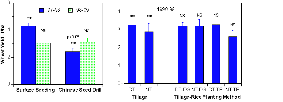 At Bhairahawa, no significant effects of tillage and crop establishment methods on rice yields have been found to date. Surface seeding of wheat immediately after the first rice crop almost doubled crop yields compared to the conventional tillage/drill establishment treatment. This was because rainfall delayed land preparation and conventional wheat planting by 40 days. However, no effect of the rice tillage treatments was seen in the first wheat crop. In contrast to the first year, yields of the second wheat crop were not significantly affected by establishment technique but were significantly higher (p<0.005) with the deep tillage treatment.