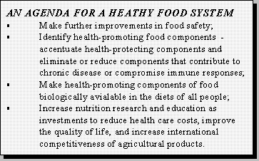 In summary, an agenda for a heathy food system must include further improvements in food safety; the exploitation of positive, health-protecting components of foods and the elimination or reduction of food components that contribute to chronic disease or compromise immunity; increased nutrition research and education as investments to reduce health care costs, improve the quality of American life, and increase the international competitiveness of American agricultural products.