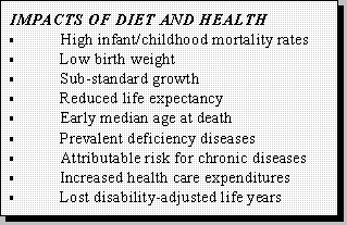 Two points are clear. First, that nutrition clearly is important to maintaining good health throughout life. This is demonstrated by observations from both developing and industrialize countries. Second, that the costs to society from not providing adequate, health-promoting food supplies are very high.