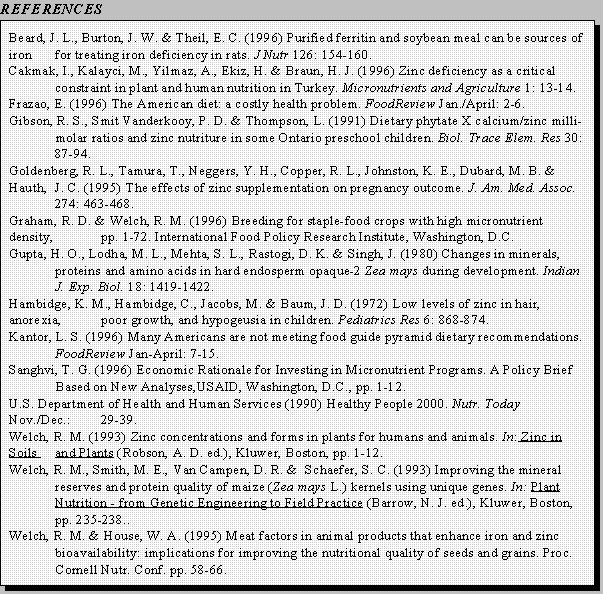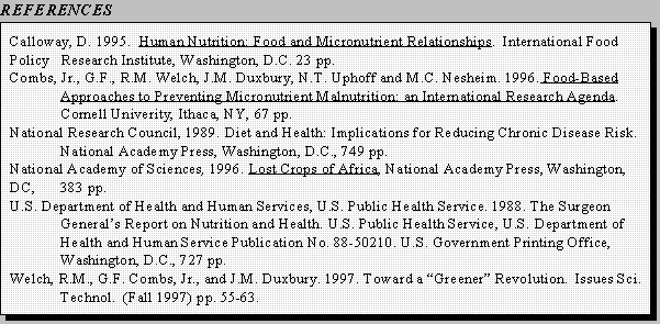 In the 1995 international workshop organized the Cornell University Food Systems for Improved Health Program, "Food-Based Approaches to Preventing Micronutrient Malnutrition: An International Research Agenda" (Combs et al, 1996), it was pointed out that malnutrition affects nearly half the world's population. More than 840 million people are estimated not to have access to enough food to meet their basic daily needs, and more than one-third of the worlds' children are stunted due to diets inadequate in quantity and quality. An estimated 2 billion people live at risk to diseases resulting from deficiencies of vitamin A, iodine and iron most of them women and children living in less developed countries. If a child does not receive required micronutrients within the first 18 months of life, his/her cognitive potential is lowered and set for life. Even in the US and other economically developed countries, iron-deficiency is estimated to affect as much as 20% of women.