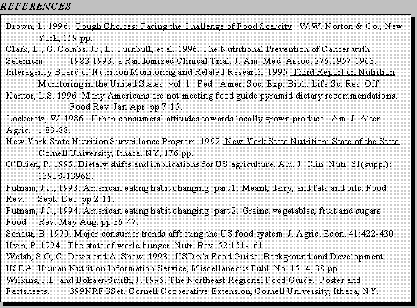 O'Brien (1995) has pointed out that bringing food production in alignment with healthful patterns of food consumption will call for strengthening and integrating farm, food and health policies with close cooperation between the public and private sectors. Among other things, this will call for efforts that increase consumer "pulls" on the marketing of healthful foods. An example of such an effort is the program in British Columbia to characterize food choices in terms related to regional agricultural production. This has been done by developing a pictorial rainbow of meat and milk products, vegetables and fruits, grain products, all of which are produced in that province. Wilkins and Bokaer-Smith (1996) have extended this approach in developing the Northeast Regional Food Guide, an interpretation of the Food Guide Pyramid that emphasizes foods grown in each season in the Northeastern US. This instrument contains such traditional foods as rutabagas and turnips, which have dwindled in popularity, taking with them significant opportunities for agricultural production in that region. Such approaches relate to the growing consumer demand for "local" foods, "local" having the connotation of quality and healthfulness (Lockeretz, 1986). These kinds of strategies could be used to link healthful diets and food production in the minds of consumers and, perhaps, provide a pull on agricultural systems towards both healthier diets and more local agricultural diversification.