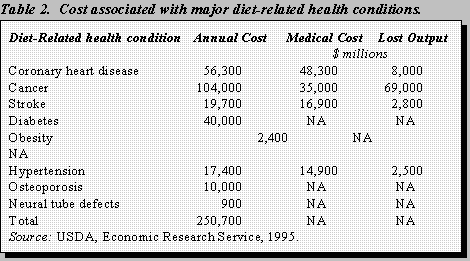 The United States has what is arguably the world's most sophisticated food and health systems; yet is also has public health problems associated with the food habits of its people - problems that erode the quality of life and impose huge costs on the society. Each year, the US has a million new cases of cancer, 1.5 million heart attacks, a half-million people affected by stroke, 13 million people with diabetes, a third of the population overweight, 50 million people with hypertension, and half of the women over fifty showing signs of osteoporosis. Collectively, these chronic diseases cost the US economy an estimated $250 billion, not to mention the many important personal impacts.