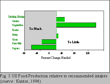 American agriculture does not appear to be producing foods, particularly vegetables and fruits, in sufficient amounts to support wide-scale consumption according to these guidelines (Fig. 3). Studies by the USDA, show that the United States currently produces 93% of meats and beans and about 100% of the grains and dairy products, but only 80% of the vegetables and about 50% of the fruits that would be needed to allow every American to eat according to the Food Guide Pyramid. On the other hand, the US over produces 133% of fats and 270% of sugars and sweeteners needed to meet the guidelines. Thus, it appears that, at present, American agricultural production is not aligned with American diet and health objectives. Of course, agriculture has been driven primarily by production, with little concern for the nutritional quality or health impact of the products produced. This speaks to a dyslinkage within the USA food system between production, the food supply and nutrition and health goals.
