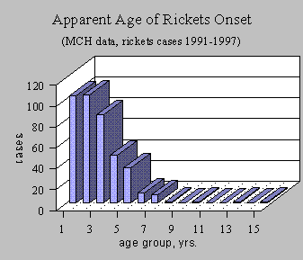 Age-Distribution of Cases. During the initial hospital visit, parents or patients were asked when they first noticed the signs of the disease. A wide range of responses was noted (1-30 yrs.); however, most cases were reported as having begun between one and three years of age (see graph). MCH clinicians have told us that they have treated rachitic children as young as six months.