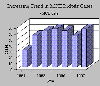 Trends in Prevalence. The records showed that from 1991-97, the number of rachitic cases at MCH increased by 124% (i.e., 20% per year) (Graph 2 ). In the 17-month period from January 1, 1997 to May 7, 1998, 113 rickets cases were seen as outpatients.