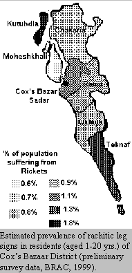 Bangladesh Rural Advancement Committee (BRAC). With the strong suspicion that rickets may be widely under-diagnosed in Bangladesh, we approached Dr. Ahbed of BRAC with the proposal that their research unit help us develop an instrument that could be useful for the rapid, community-based assessment of rickets prevalence. Our idea was to develop a way of ultimately preparing a "rickets map" of the country to determine how widespread/focused is the prevalence of the disease - either of which outcomes would be informative as to it etiology. We were very pleased that BRAC was eager to collaborate on such an effort and that Dr. Moustaq Chowdhery, a very experienced researcher was identified to lead the effort. Working with Dr. Chowdhery's group, we developed and pilot tested simple survey instrument appropriate for use by non-medical personnel, i.e.,an instrument that can be used by community workers to survey their community and note down relevant information about probable rickets cases. The instrument, which consisted of a 1-page poster showing photographs of the major leg signs of rickets, was employed in a survey designed to yield statistically valid thana-level estimates of the prevalence of rickets leg signs prevalence in Cox's Bazaar District.